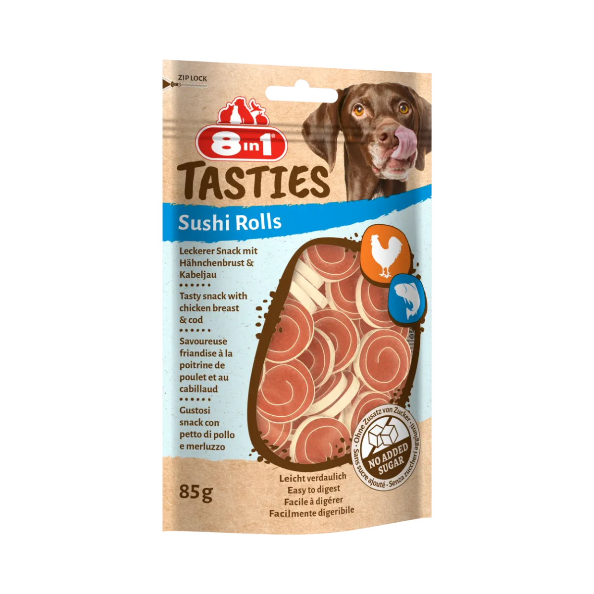 8in1 Sushi Rolls are easy to digest, have no added sugar and are low in fat. They are formulated without flavour enhancers, GMOs, artificial preservatives and colourings. The oven baked treats are rich in protein and do not contain gluten. 8in1 Tasties Sushi Rolls are an ideal snack for all size dogs. Let your dog enjoy our tasty Sushi Rolls!