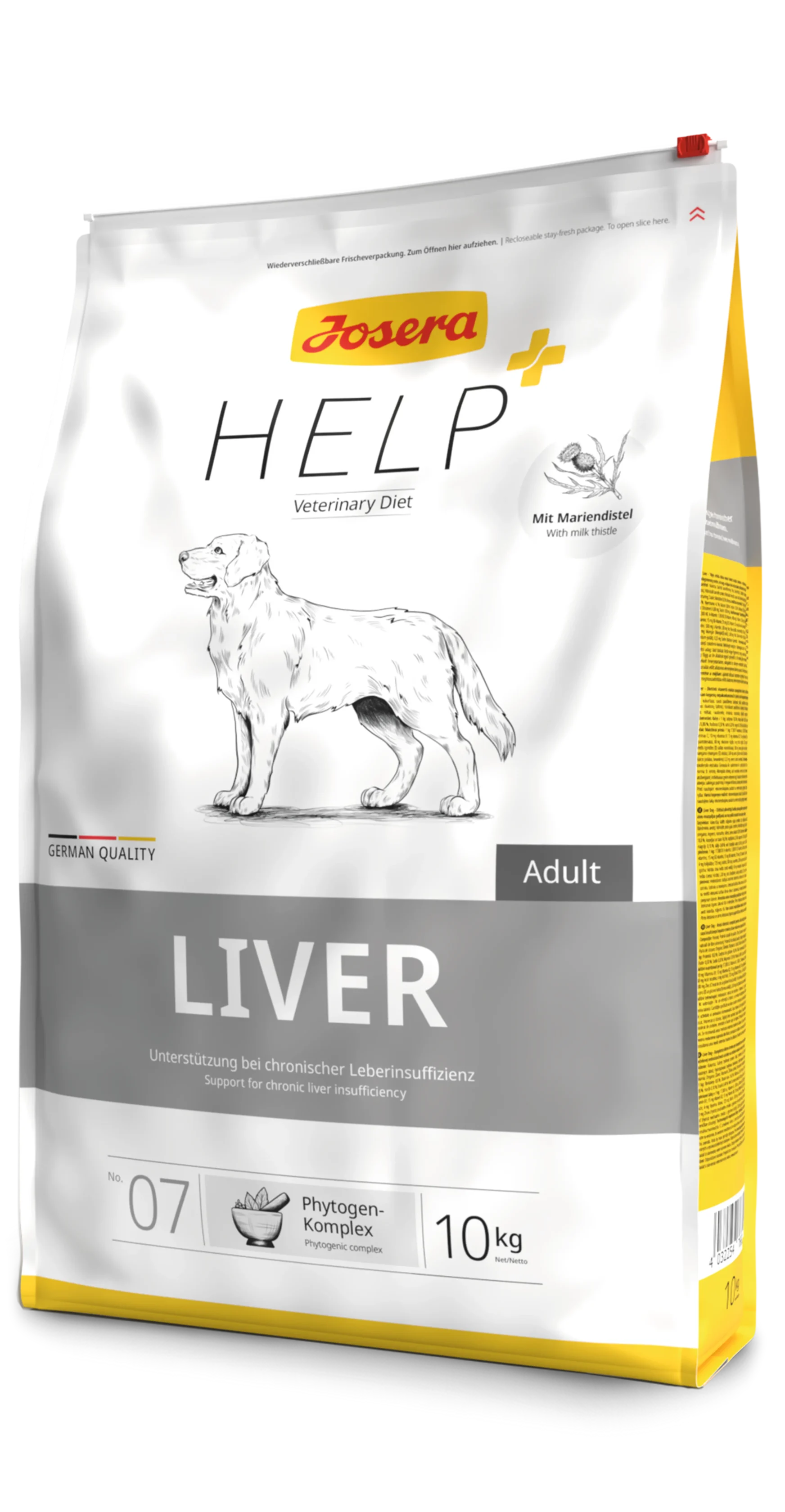 If your beloved pet suddenly loses their appetite, seems apathetic and experiences weight loss, this may in some cases be due to chronic liver failure: our Josera Help Liver dry food has been developed for this scenario! This dietary complete feed is custom designed with a special recipe to provide optimal nutrition for dogs with liver disease. Josera Help Liver contains valuable milk thistle. This is traditionally used to support liver function and can help prevent excessive strain on the liver. Vitamin C and other valuable antioxidants can protect against free radicals. L-carnitine helps the fat metabolism. The reduced protein and copper content in turn is important to take the strain off organs that are vital for metabolic processes. If a dog has been diagnosed with chronic liver failure, there are a couple of dietary adjustments that can help improve your pet’s health: the key thing is to reduce the supply of protein and copper and avoid offering snacks containing lots of connective tissue. The best approach is to offer lots of smaller meals with the dietetic feed spread throughout the day. Together we can combat ill health to ensure an enjoyable life for your dog.