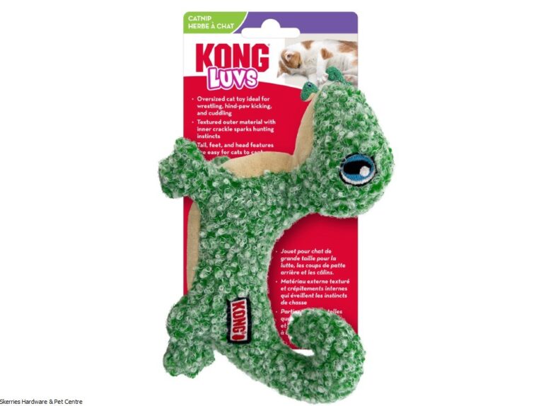 KONG Cat Luvs Lizard is ready for rounds of active play with your cat! This oversized cat toy is ideal for full-body play sessions, with uniquely textured outer material and an inner crackle that sparks wrestling and hind paw kicking. Easy-to-capture features like its head, feet, and tail make this lizard an ideal contender. KONG Premium North American Catnip inside keeps cats coming back for energetic rounds of solo play. When your cat is tired from all the action, the Luvs Lizard becomes the perfect snuggle buddy.