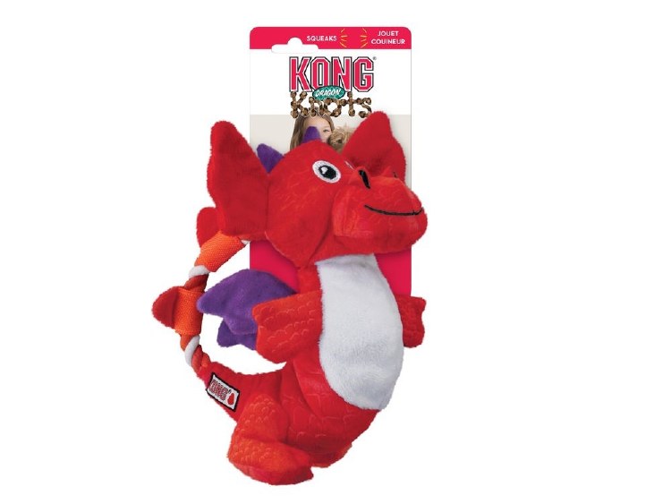 KONG Dragon Knots are a whimsical addition to the Knots collection. The realistic feel of the internal knotted rope, big body squeaker and crinkling sound of the magical wings get dogs geared for play and satisfies their natural instincts. The strong rope knot tug toy has minimal stuffing for less mess and charms with long-lasting fun.