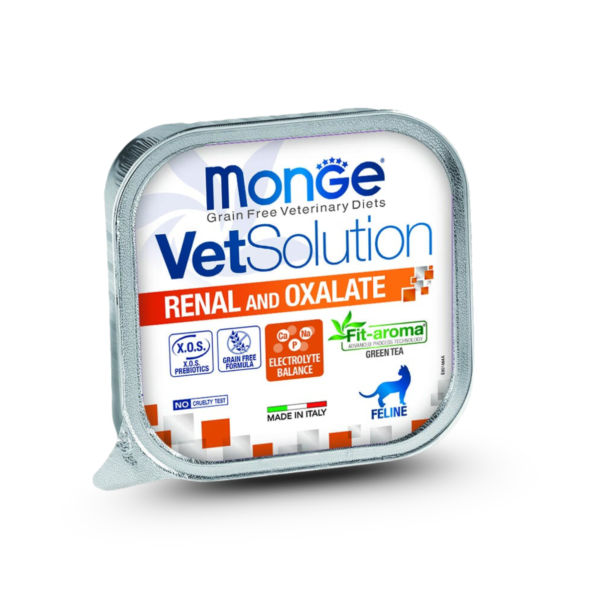 Monge VetSolution Renal and Oxalate Feline is a complete dietetic petfood for cats formulated for the support of renal function in the case of chronic or temporary renal insufficiency. It is also formulated for the reduction of oxalate stones formation. Contains Nucleotides to support immune system, Green tea for renal support, Xylo-oligosaccharides (XOS) to secure the intestinal microbiota. The formulation is characterized by low level of protein but high quality and restricted levels of phosphorus, low level of calcium, low level of vitamin D, and urine alkalising properties.