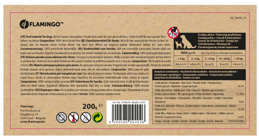 - Features: Made from 100% dried chicken feet. According to Flamingo.be , it is gluten-free and made in Europe.